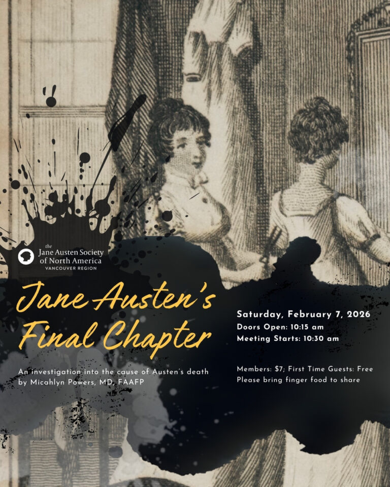 - February 15: Chalk and Cheese: Siblings as Opposites in the Novels – Member Panel Discussion featuring Barbara Phillips (Elinor & Marianne Dashwood), Phyllis Ferguson Bottomer (Mrs. Norris & Lady Bertram), Ilze Hillier (Elizabeth & Anne Elliot), and Naomi Sutherland (The Bennet Sisters).
